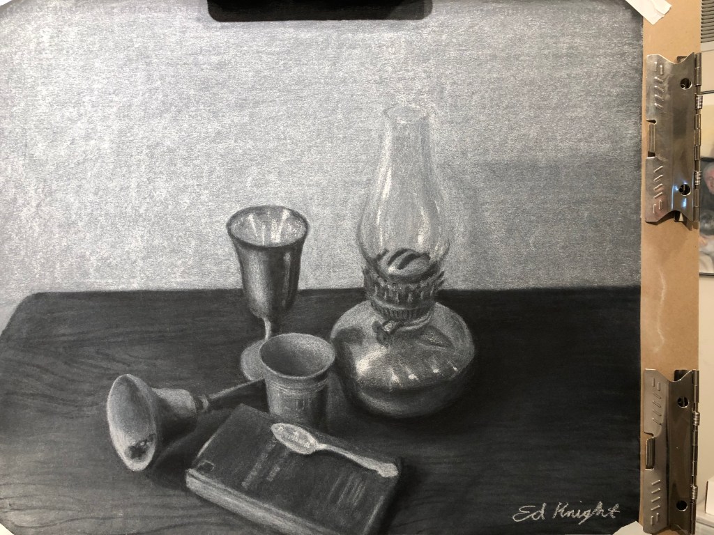 Still Life for class, 2020-05-07; white Conte sketching crayon on black paper
